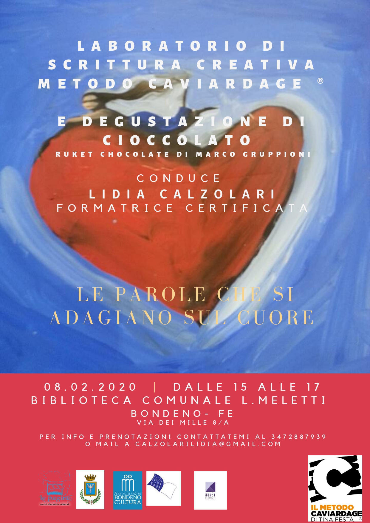 Sabato 08/02, dalle ore 15 alle ore 17, l'insegnante certificata Lidia Calzolari svolgerà un laboratorio di scrittura creativa con Metodo Caviardage dal titolo "Le parole che si adagiano sul cuore", un ottimo momento per prepararsi a cercare le giuste parole d'amore per l'arrivo di San Valentino. Il laboratorio sarà inoltre arricchito dalla degustazione di cioccolato organizzata in collaborazione con Marco Gruppioni di Rukèt Chocolate di Sant'Agostino.