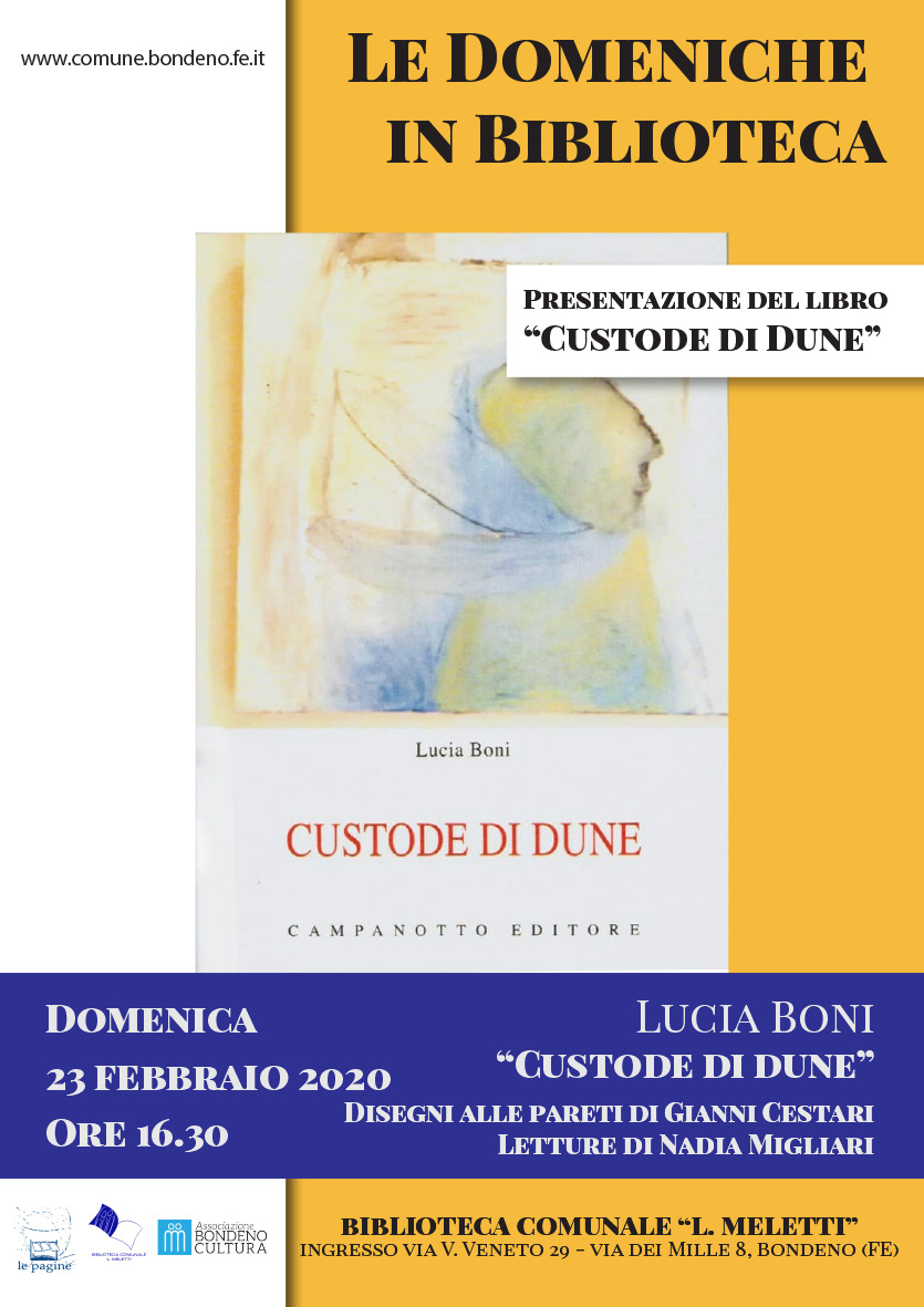 L'ultimo appuntamento di febbraio per il ciclo de "Le domeniche in biblioteca", organizzato in collaborazione con Ass. Bondeno Cultura, si conclude con l'appuntamento dedicato al libro di Lucia Boni dal titolo "Custode di dune", Campanotte editore, 2018, in programma domenica 23 febbraio alle ore 16.30. "Custode di dune" nasce come una trascrizione di pensieri, ma nella stesura si sviluppa come un dialogo tra due voci, una narrante e una pensata sottovoce, un soffio quasi senza sonorità. Si sviluppa in tre scene e un finale "a sipario chiuso", tanto che nell'insieme appare come una situazione teatrale. La presentazione, accompagnata dalle letture a cura di Nadia Migliari, sarà inoltre arricchita dalla mostra temporanea di disegni di Gianni Cestari, il quale ha realizzato la copertina del libro.