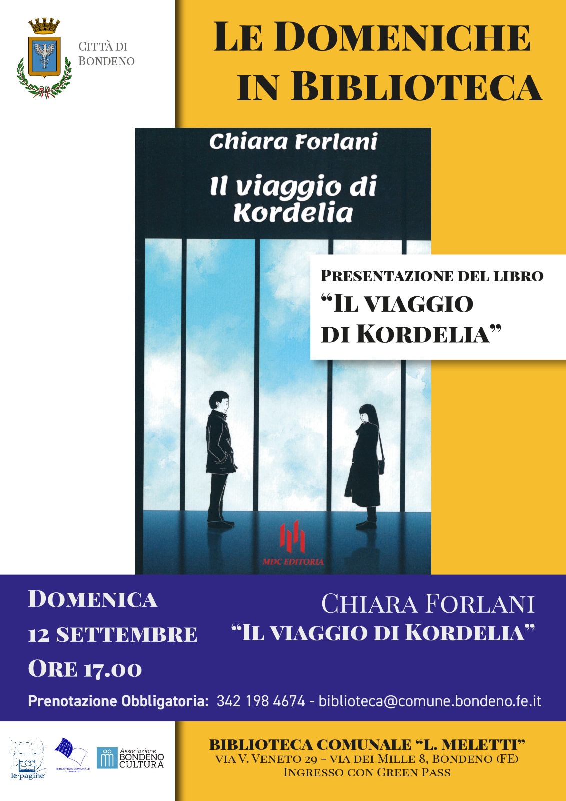 Il primo appuntamento che apre la rassegna sarà domenica 12/09 alle ore 17 con la presentazione del libro di Chiara Forlani dal titolo "Il viaggio di Kordelia", un romanzo per ragazzi che la scrittrice e insegnante ospedaliera ha scritto per raccogliere fondi a favore dei reparti pediatrici.