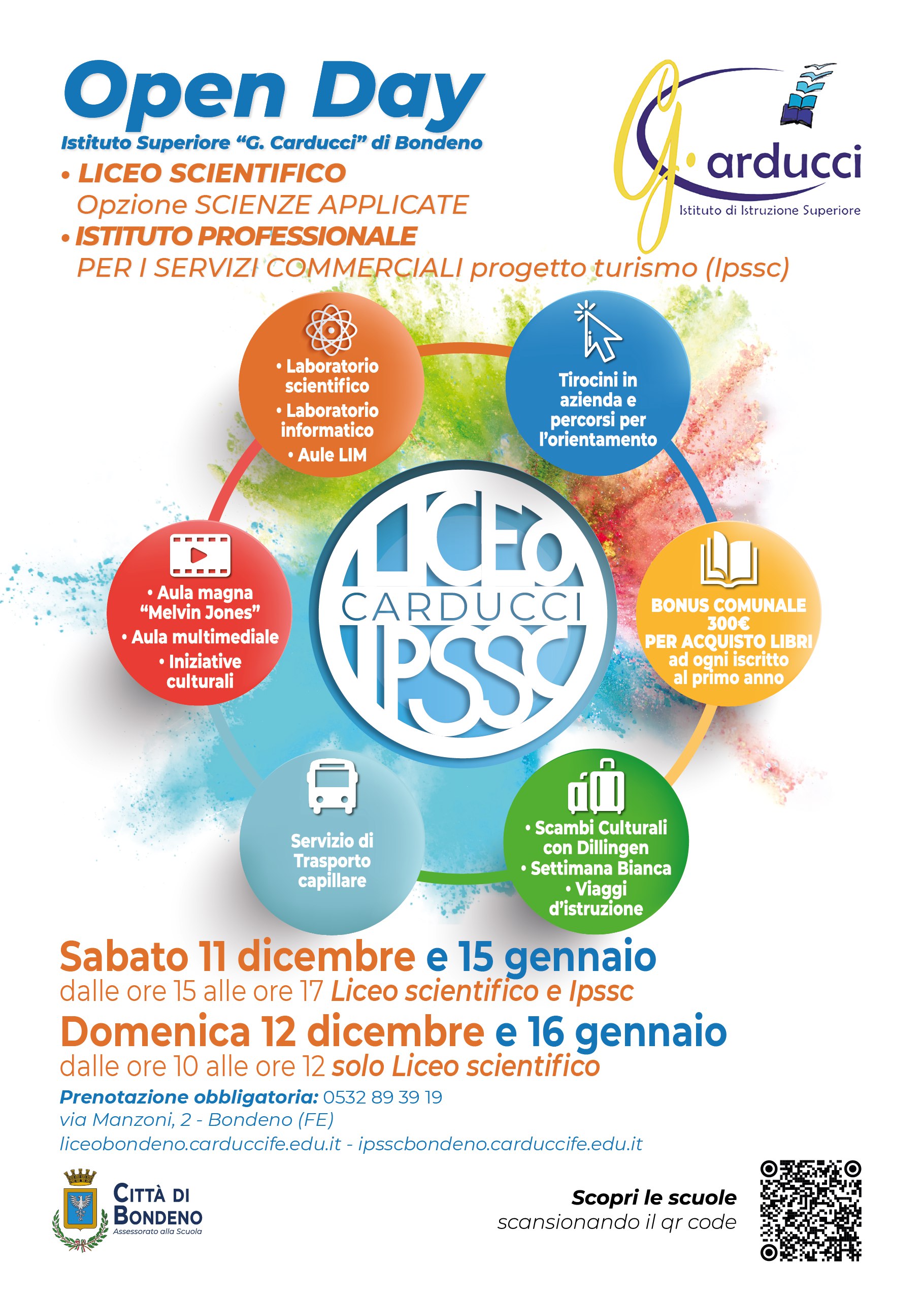 Per conoscere da vicino l’Istituto Carducci di Bondeno, si può prenotare una fra le seguenti date di presentazione (open day), in cui alunni di seconda e terza media (secondaria inferiore) e rispettivi genitori possono entrare in contatto diretto con la scuola, i suoi spazi, i docenti e gli studenti.